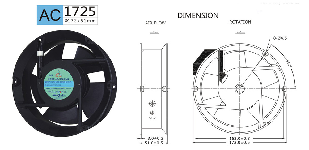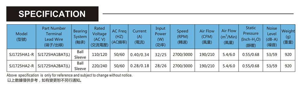框架:鋁ADC-12 軸承:含油軸承&雙滾珠軸承 電壓:AC 110V 220V 380V440V 壽命:60 000Hours at 20℃--滾珠軸承 30 000Hours at 20℃--含油軸承 工作溫度:-20℃~85℃ 正常濕度 儲存溫度:-30℃~140℃ 正常濕度